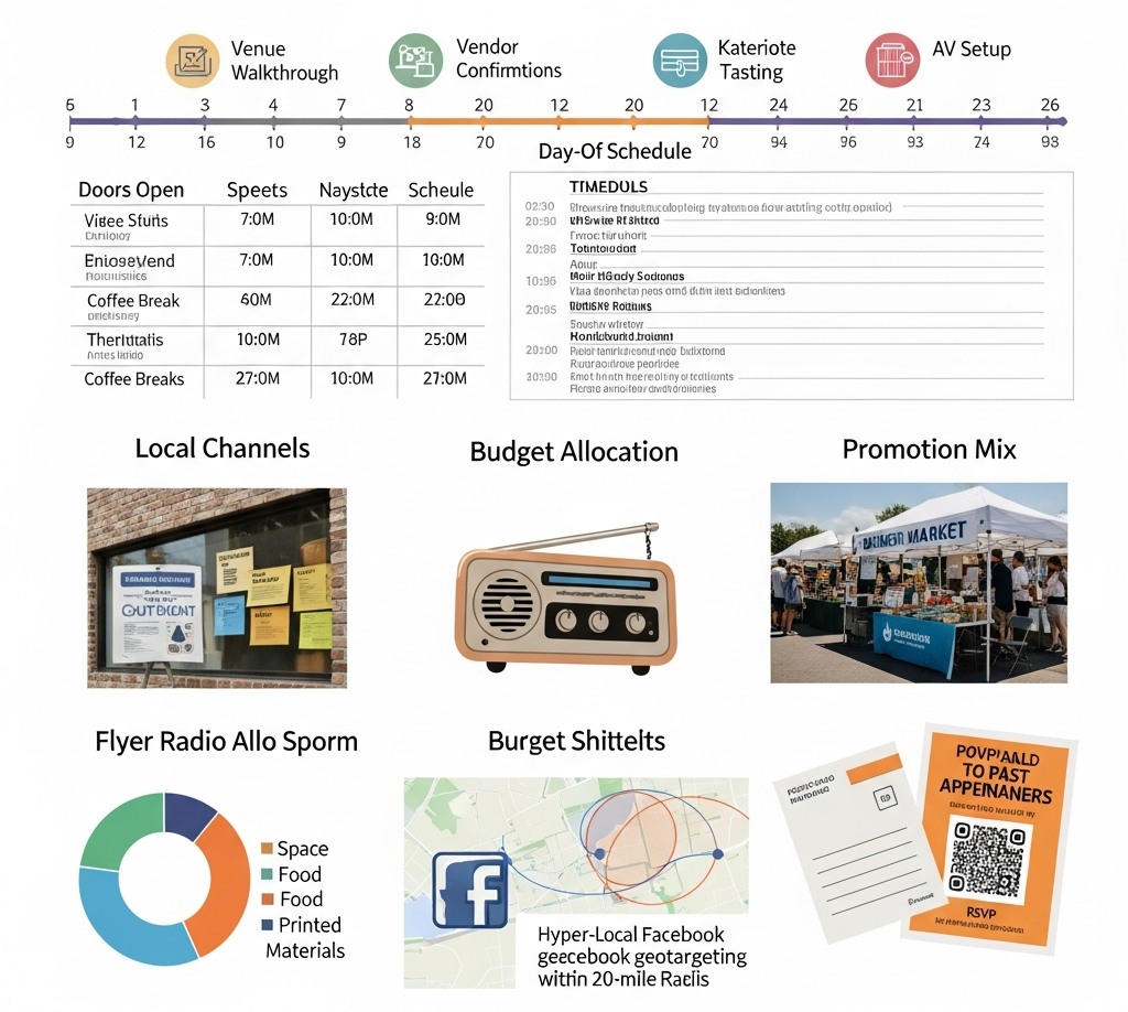 Timeline front-loads venue walkthroughs and vendor confirms (catering tasting at eight weeks, AV setup at four), with a day-of run sheet down to the minute: doors open 8:45, keynote 9:15, coffee break 10:30. Budget slices big for space (35%), food (25%), and printed materials (15%), leaving ads for hyper-local Facebook geotargeting within a 20-mile radius. Promotion mixes old-school (postcards to past attendees) with new (QR codes on posters linking to RSVP).