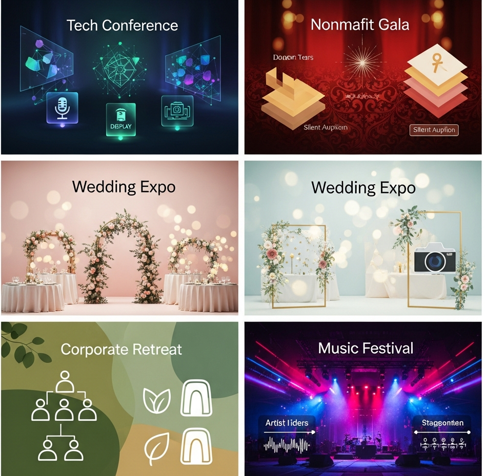 Different sectors need different flavors, so this industry-specific event marketing template is tweaked for the crowd tech conferences pack speaker one-pagers and demo slot sign-ups, nonprofit galas add donor tiers and silent auction trackers, wedding expos slot vendor booths and styled shoot schedules. A corporate retreat version includes team-building breakout grids and dietary request forms, while a music festival one layers artist rider confirmations and stage changeover times.