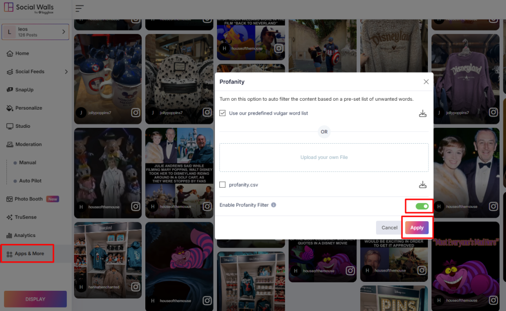 Step 7: Now, navigate to the Apps and More section, where you’ll find the option to enable the profanity filter in social walls.