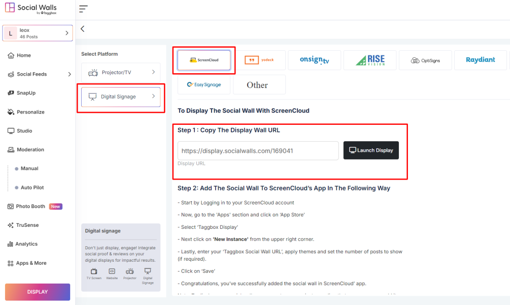 Step 7: Go to Digital Display → Digital Signage → ScreenCloud and copy the generated display URL.
