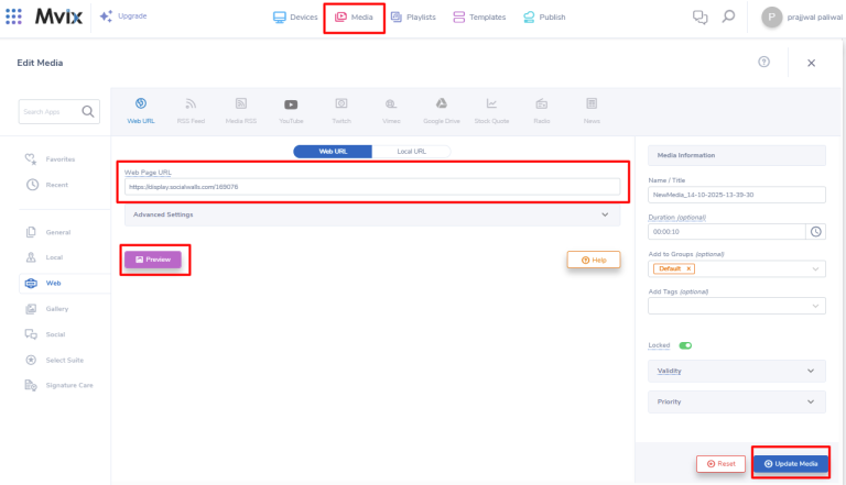 Step 9: In the Web Page URL field, paste the copied Embed URL of your Social Wall on Mvix.