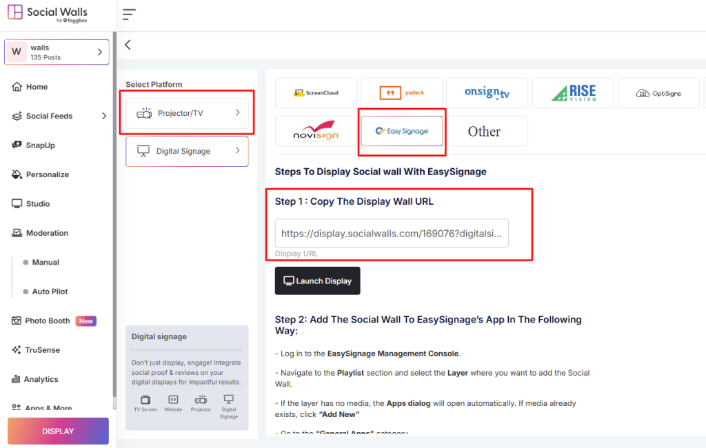 Step 7: Click the Display button at the bottom-left corner. Then, under Integrate with Digital Display → Digital Signage, there you will get social wall display url.