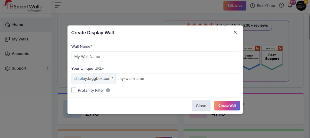 Click on My Walls and select Create Wall. This wall will serve as your workspace for customizing the layout, theme, moderation options, and appearance for embedded videos.