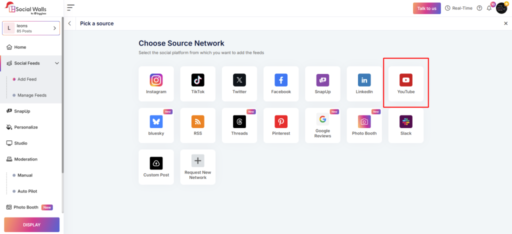 Choose YouTube as the platform to connect your video content. Selecting it ensures your YouTube embed video feed pulls the correct videos and syncs updates automatically.