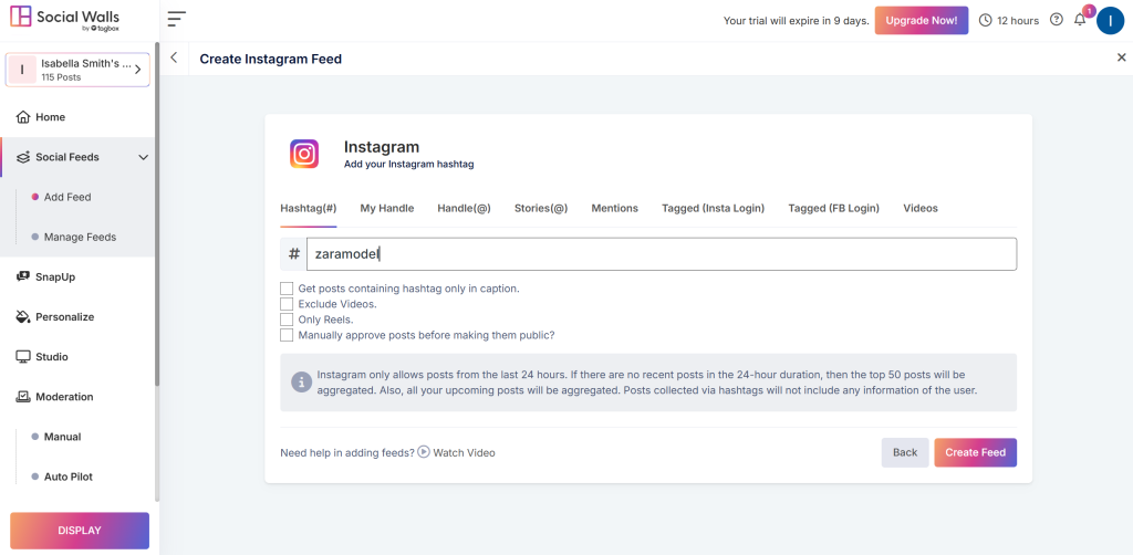 Step 5: Now, Click the “Create Feed” button to collect the Hashtag (#) feeds to the Social Walls.