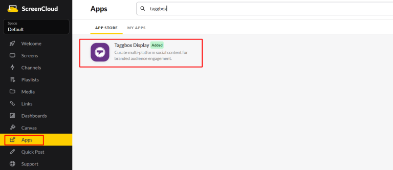 Step 7: Login to ScreenCloud, navigate to Apps, search for Taggbox Display, and click ‘Get New Instance’.