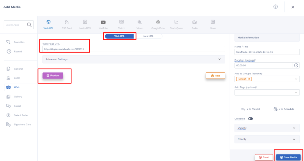 Step 8: Login to Mvix Digital Signage. Go to the Media tab and click Add Media. Paste your copied Embed URL into the Web Page URL field.