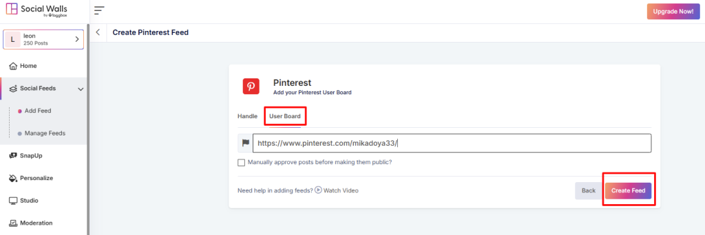 Step 5: Now, it’s time to decide how you want to fetch Pinterest feeds. You’ll have two options: