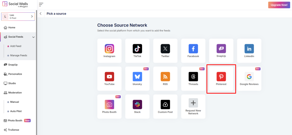 Step 4: Next, choose the social media source from which you want to fetch your feeds. Choose Pinterest for feeds.